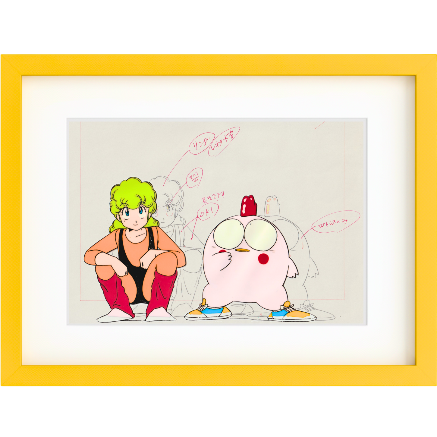 Original production cel and layout drawing from Gu-Gu Ganmo (1980s). The work shows Hanpeita Tsukuda and Ganmo crouched together, captured in a typical scene of pause and mischief. The red annotations indicate color and lighting instructions for cel painters, marking the precise coordination between drawing and paint. Both pieces are well preserved, with clean pencil work and vivid color application—an excellent example of everyday animation craft from the period.