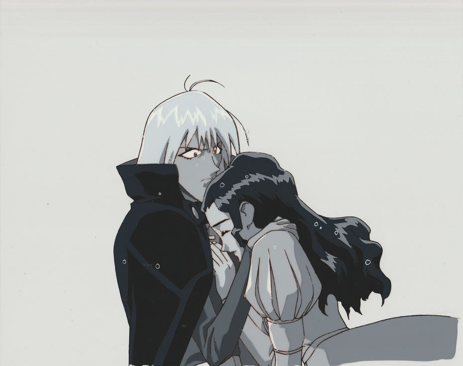 A scene from the 1996 cult-classic OVA Master of Mosquiton. This rare set features the titular vampire, Alucard von Mosquiton, and his headstrong master, Inaho Hitotose, in a moment of intense emotional gravity. The unique grayscale (black, white, and gray) palette of this production cel marks it as a rare "flashback" or "stylized atmospheric" piece, stripping away color to focus on the raw, dramatic tension between the immortal and the seeker.