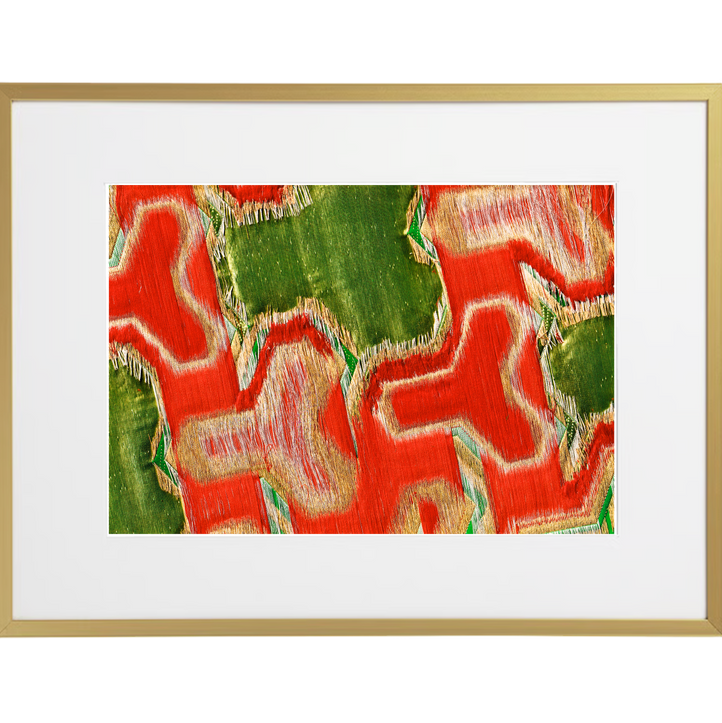 The reverse side of a Nishijin-woven obi reveals a complex interplay of metallic and silk threads, a structural beauty usually hidden from view. The weaving’s back forms an abstract rhythm of color and light, where each tensioned thread records the weaver’s minute adjustments by hand.